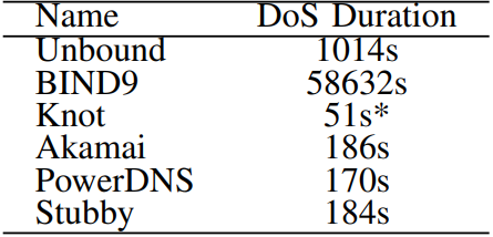 A duração desse estado de DoS depende da implementação do resolvedor, mas os pesquisadores dizem que uma única solicitação de ataque pode reter a resposta de 56 segundos a até 16 horas.