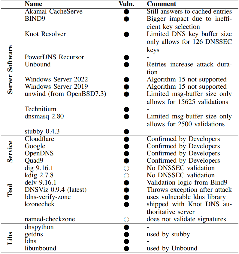 Os pesquisadores demonstraram como seu ataque KeyTrap pode impactar provedores de serviços DNS, como Google e Cloudflare, desde o início de novembro de 2023, e trabalharam com eles para desenvolver mitigações.